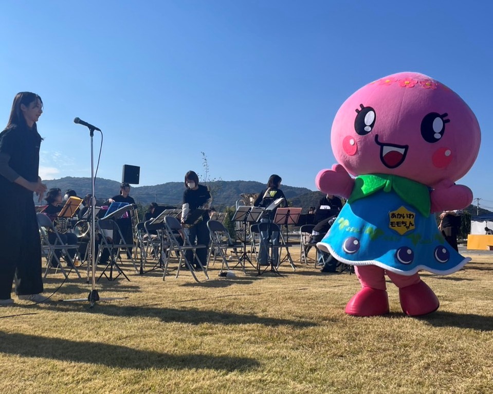 演奏前には、あかいわモモちゃんがあかいわWINDの応援に駆けつけてくれました♡